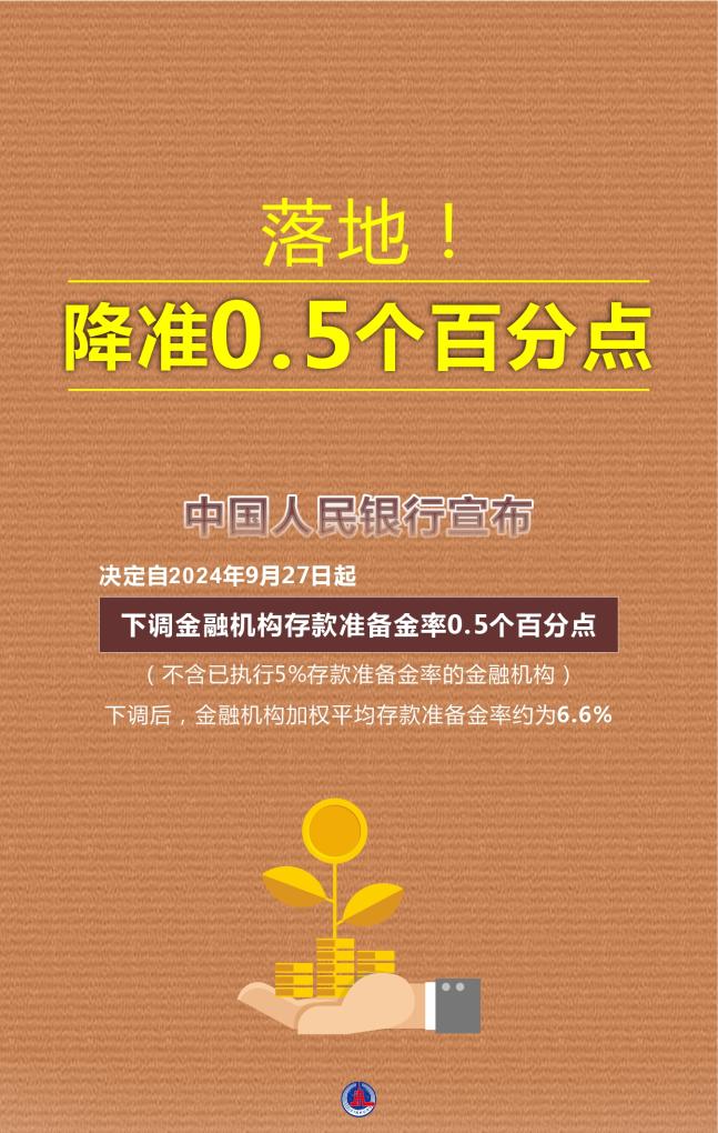 新华社北京9月27日电(记者吴雨、任军)中国人民银行27日宣布,决定自2024年9月27日起,下调金融机构存款准备金率0.5个百分点(不含已执行5%存款准备金率的金融机构)。本次下调后,金融机构加权平均存款准备金率约为6.6%。