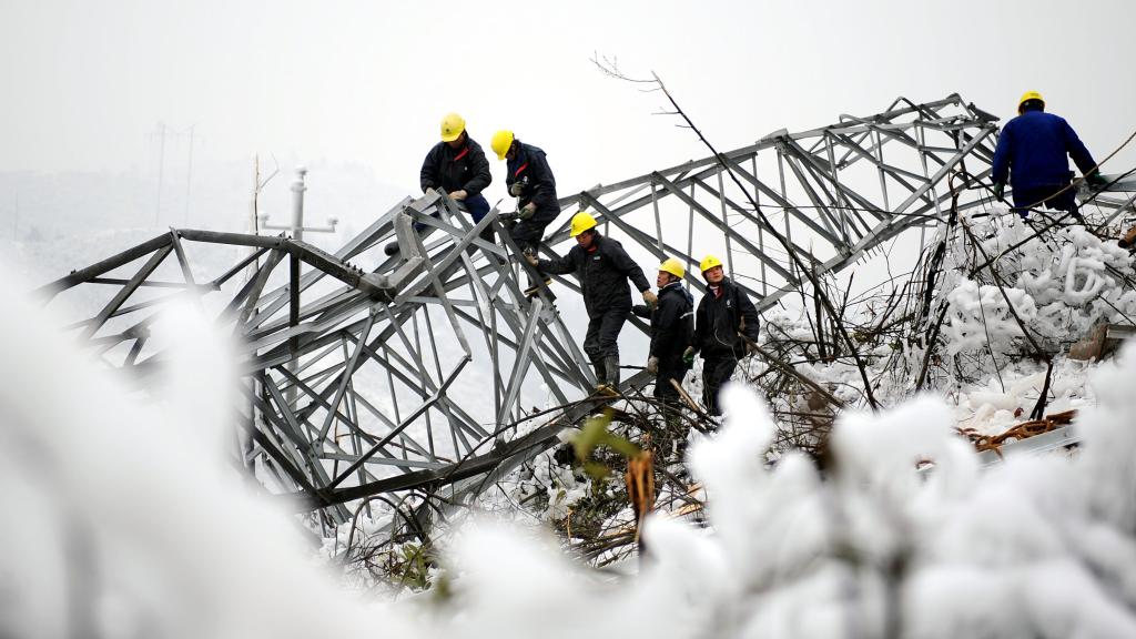 2008年2月6日,工程人员在湖南郴州被冰雪压塌的高压电塔上施工。新华社记者 赵众志 摄