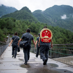 2019年8月30日,云南怒江傈僳族自治州贡山县人民法院法官邓兴背着国徽,与同事们跨过怒江。新华社记者 江文耀 摄