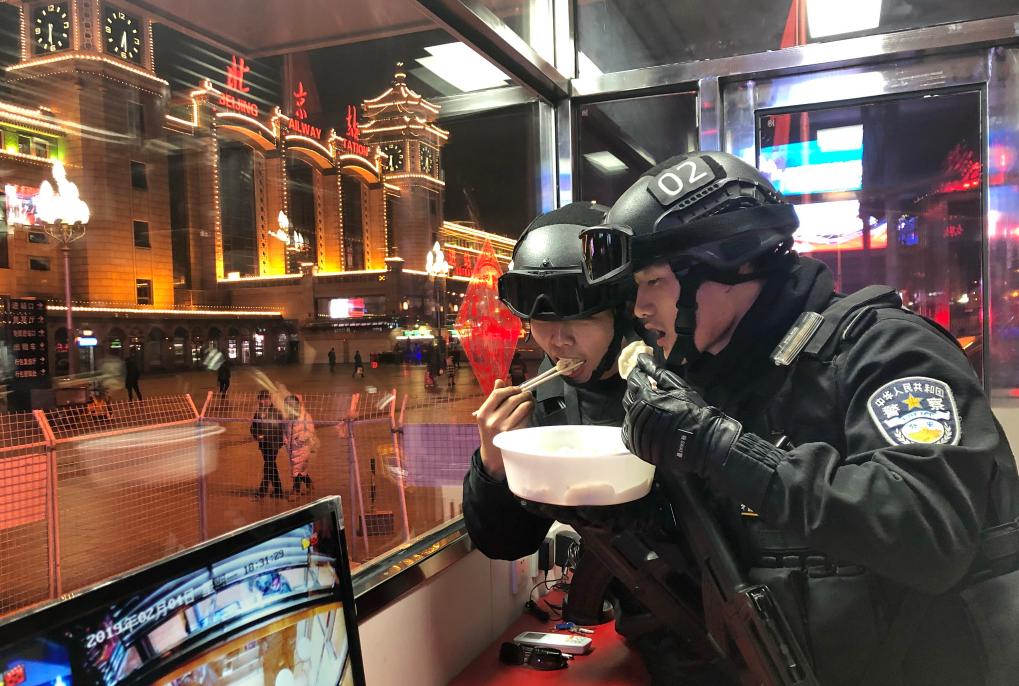 2019年2月4日是农历除夕,在北京火车站执勤的铁鹰突击队队员吃到单位送来的饺子。新华社记者 李欣 摄