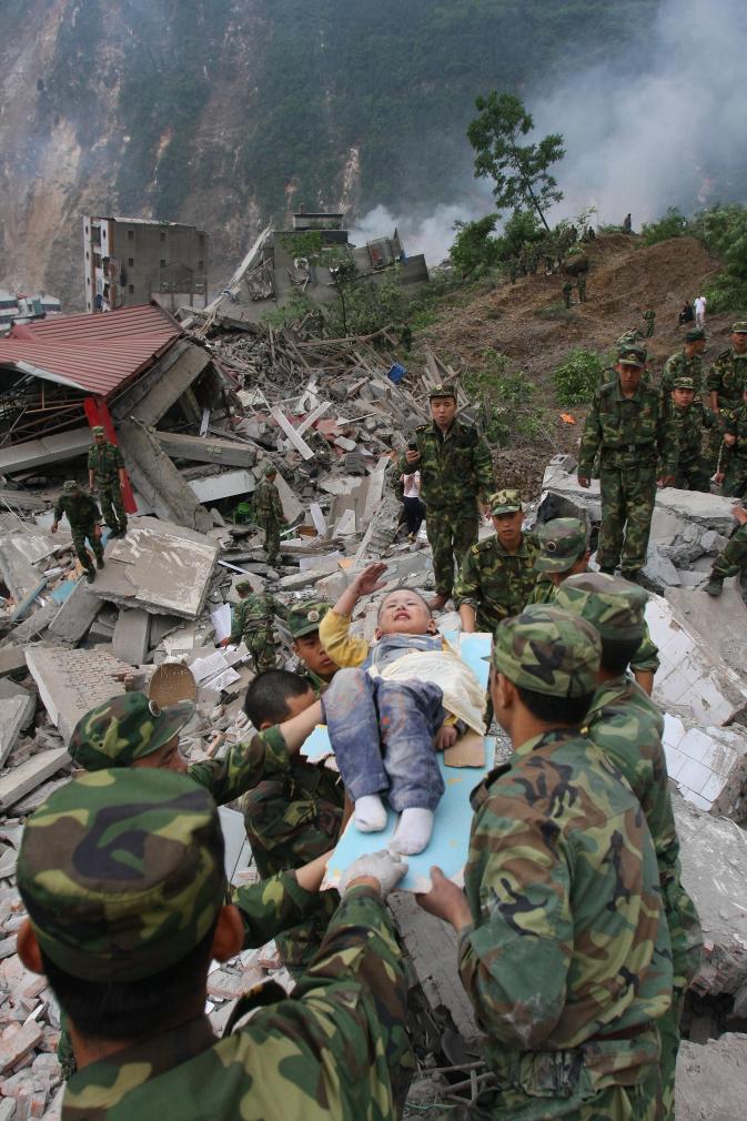 2008年5月13日,在四川汶川地震北川灾区的一片废墟中,3岁的小郎铮获救后向解放军战士敬礼。新华社发(杨卫华 摄)