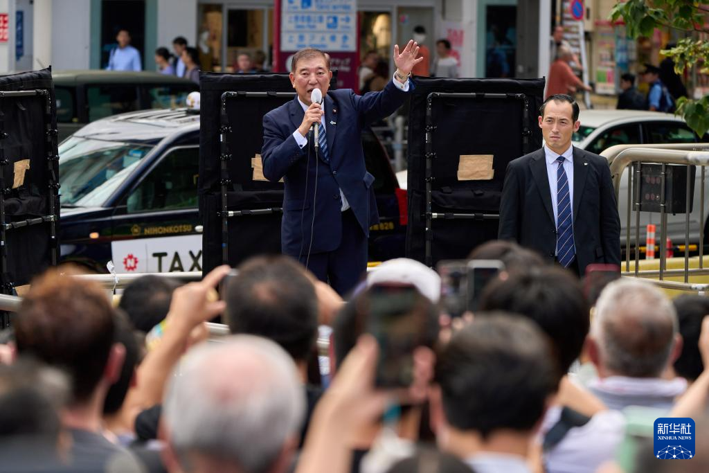 9月26日,石破茂在日本东京上野车站前进行演讲。新华社记者 张笑宇 摄