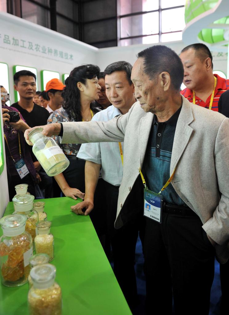 2011年10月26日第八届中国—东盟博览会开放日,“杂交水稻之父”袁隆平亮相现代农业技术馆,对木薯、罗汉果,境外杂交水稻等农作物生产技术进行详细调研。新华社记者张爱林 摄