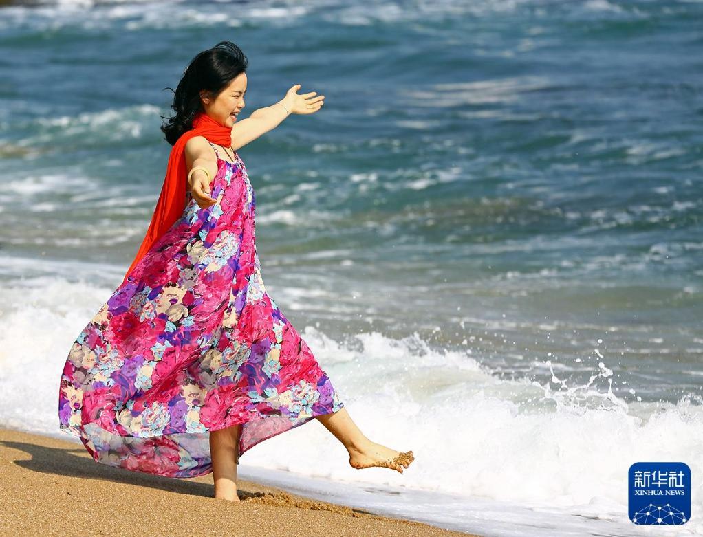 2018年2月13日,一名身穿花裙的游客在海南三亚海边嬉浪。新华社发(陈文武 摄)