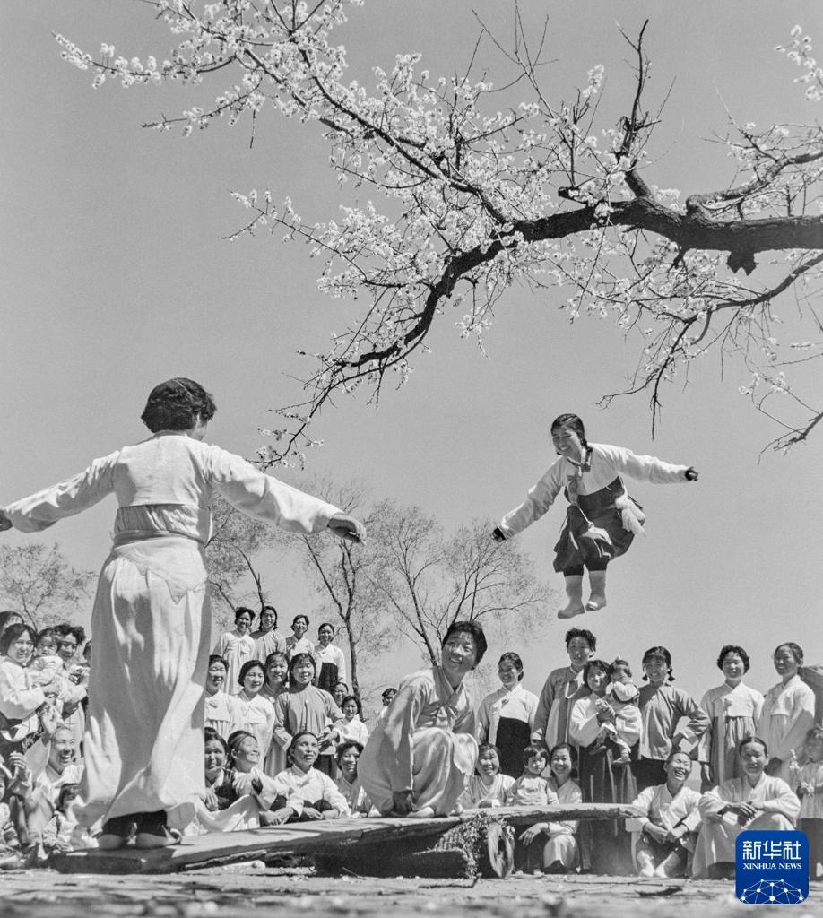 1972年5月31日,吉林延边朝鲜族自治州,身着朝鲜族传统服饰的妇女们参与传统游戏跳跳板。新华社发(全悬三 摄)