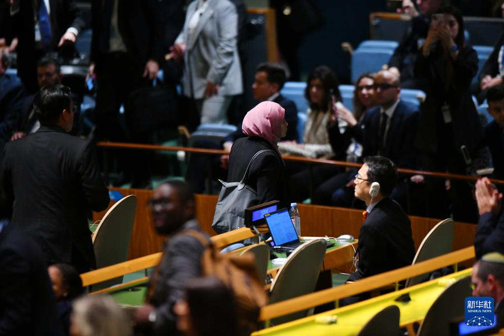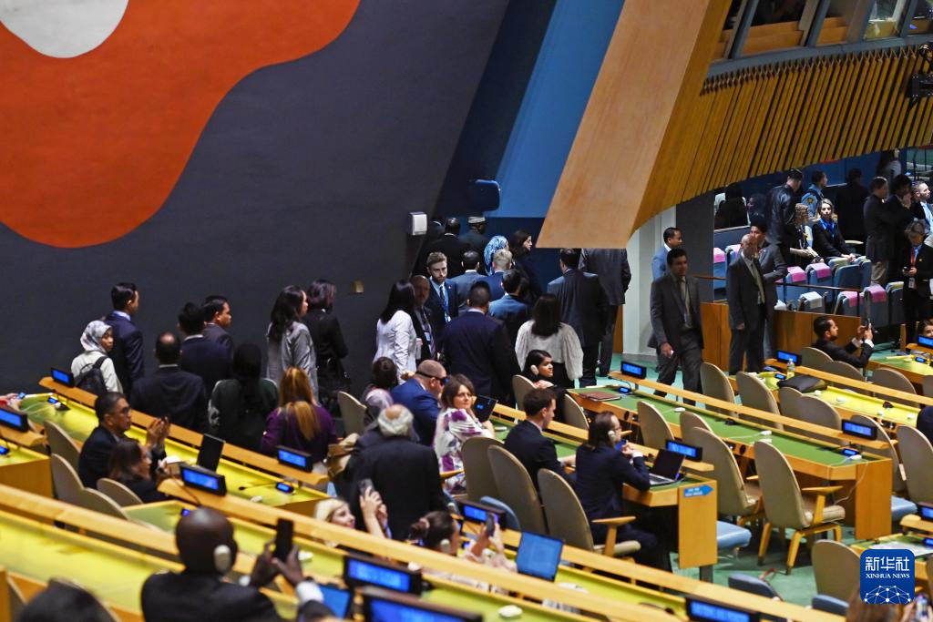 9月27日,在位于纽约的联合国总部,以色列总理内塔尼亚胡走上第79届联大一般性辩论的讲台时,一些国家的代表起身离场。新华社记者 李睿 摄