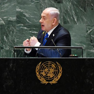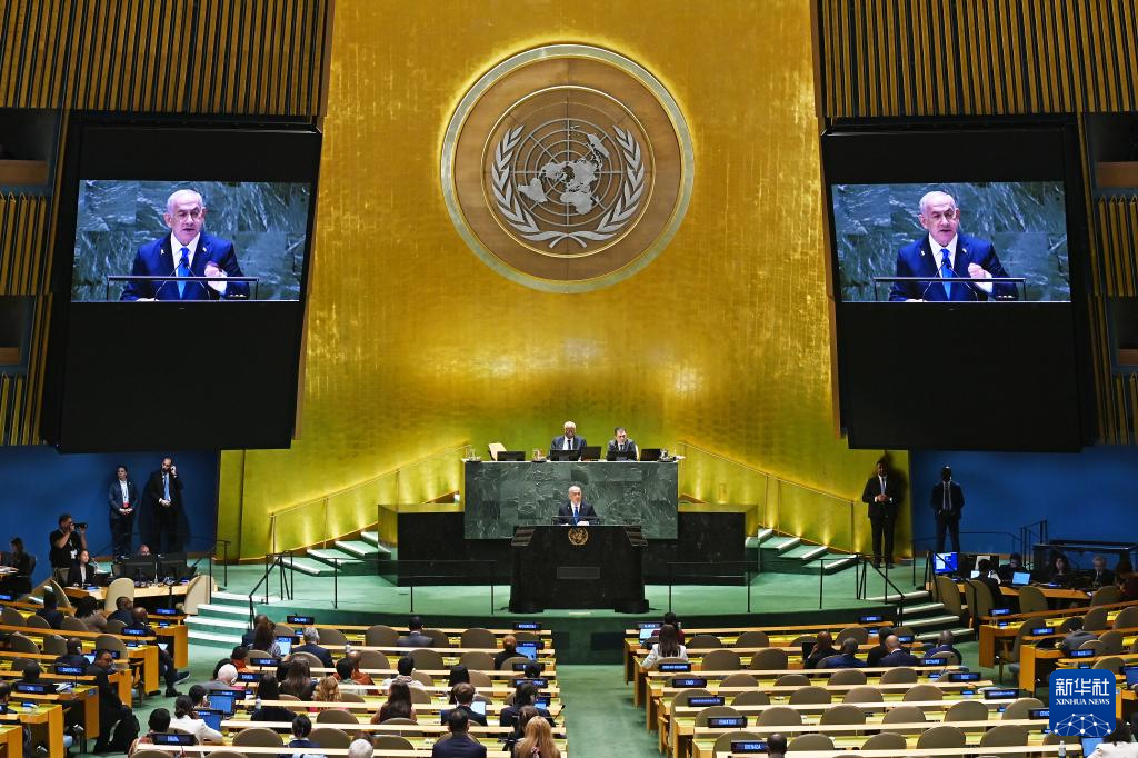 9月27日,在位于纽约的联合国总部,以色列总理内塔尼亚胡在第79届联大一般性辩论上发言。新华社记者 李睿 摄