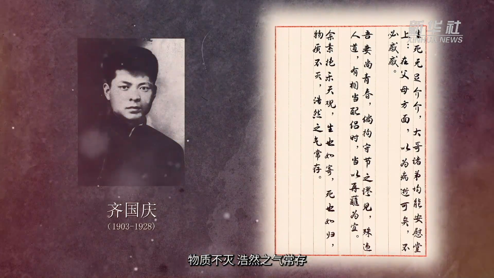 在狱中的齐国庆一直幽默乐观。慷慨赴死前,他这样托付难友:“我死后,务必请你转告我家:一、不用棺,一切从简;二、妻子不必为我守节;三、为革命而死光荣,父亲不必伤悲。”