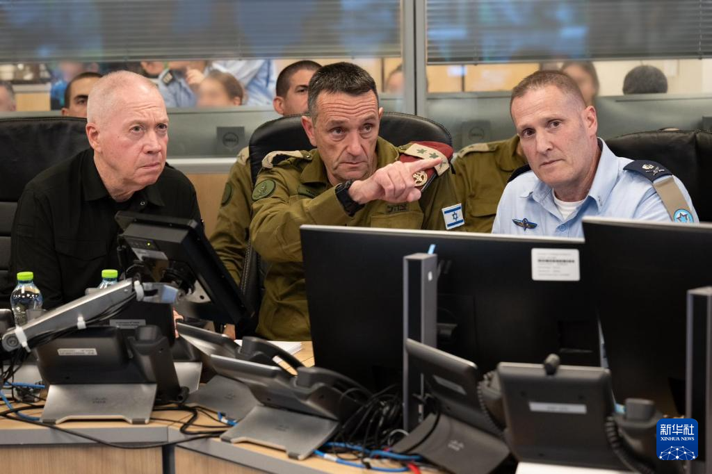 9月27日,在以军空袭黎巴嫩真主党总部期间,以色列国防部长加兰特(左一)、以色列国防军总参谋长哈莱维(中)在以空军一处基地内。新华社发(以色列国防部供图)