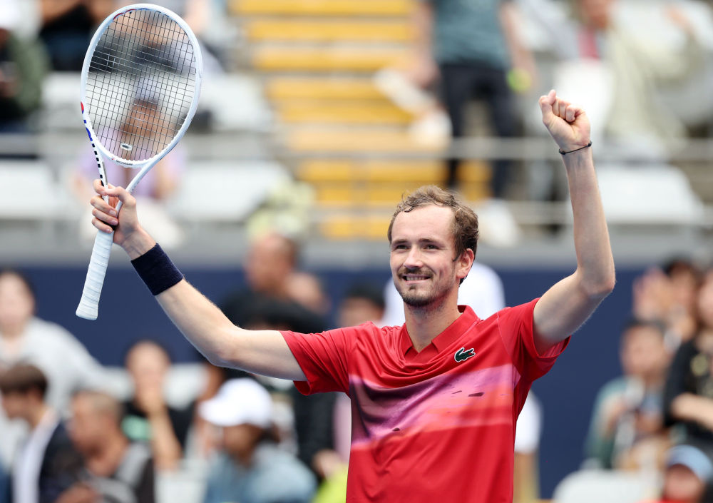 9月27日,梅德韦杰夫在比赛后庆祝胜利。新华社记者 张晨霖 摄