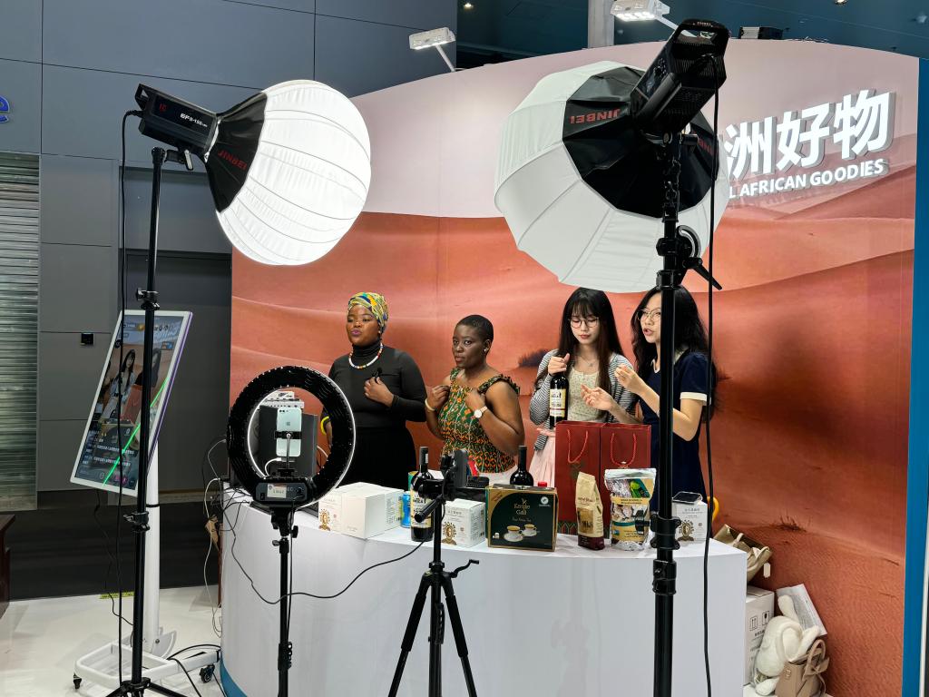 南非的红酒、埃塞俄比亚的咖啡、肯尼亚的红茶……在“智慧非洲”展台一角,来自南非和中国的4名大学生变身带货主播,通过TikTok和抖音平台将各类“非洲好物”推广至海内外。