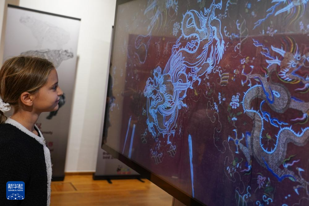 9月27日,在比利时布鲁塞尔中国文化中心,观众在“看见中国”之《纹样与色彩:中华工艺之美》数字文化展上参观。新华社记者 彭子洋 摄