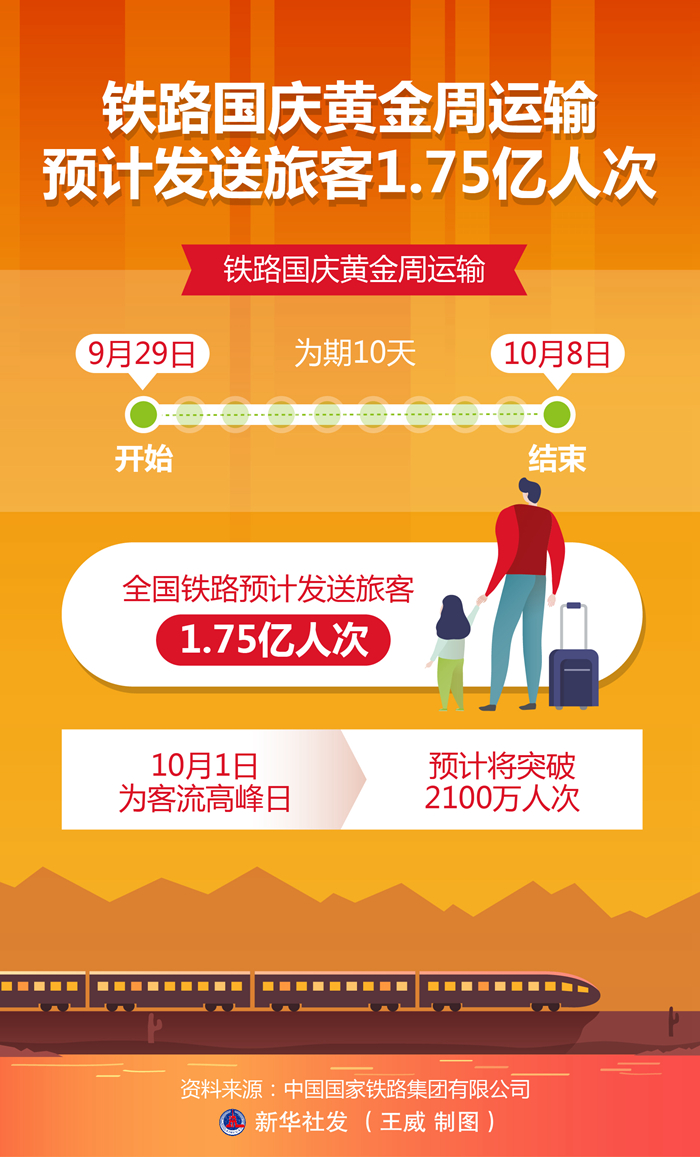 新华社北京9月29日电(记者樊曦)记者从中国国家铁路集团有限公司获悉,铁路国庆黄金周运输自9月29日开始,至10月8日结束,为期10天,全国铁路预计发送旅客1.75亿人次,10月1日为客流高峰日,预计将突破2100万人次。