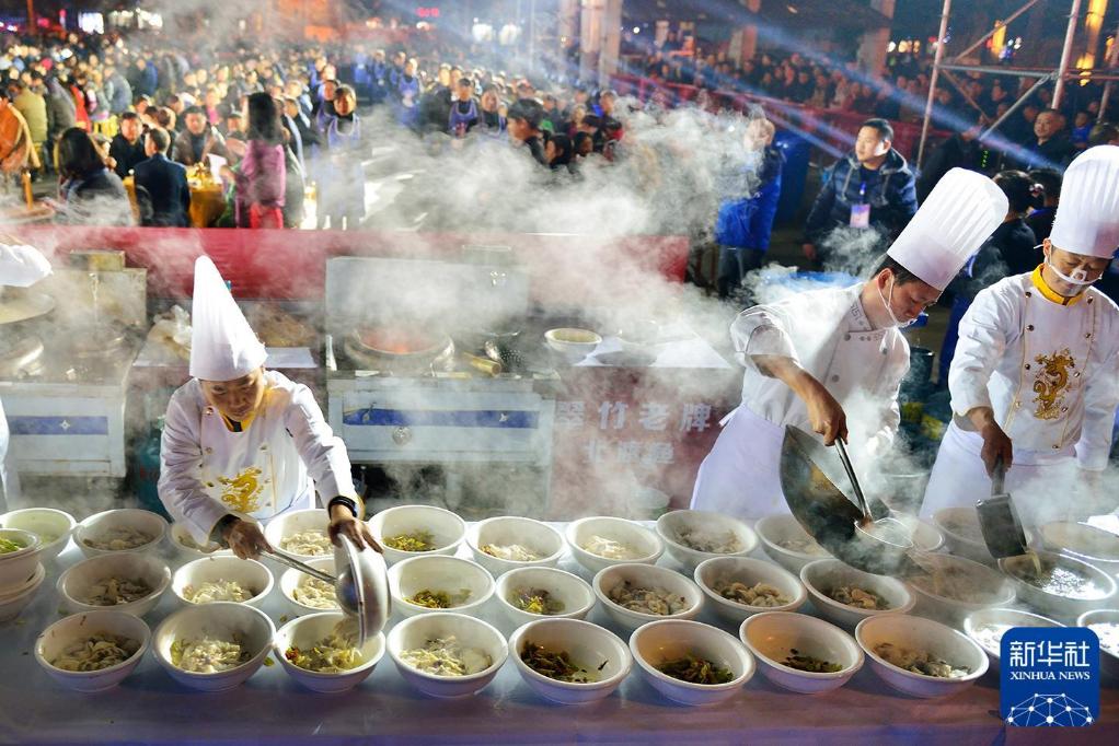 2016年12月16日,在重庆綦江区营盘山广场,厨师们忙着烹饪綦江特色美食“北渡鱼”。新华社发(陈星宇 摄)