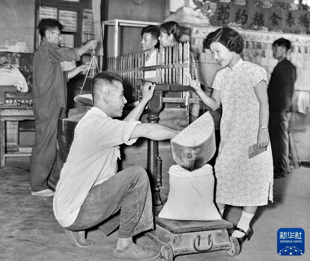 1971年,辽宁沈阳铁西区工人村第一粮站售货员在售粮。新华社发(李正丹 摄)