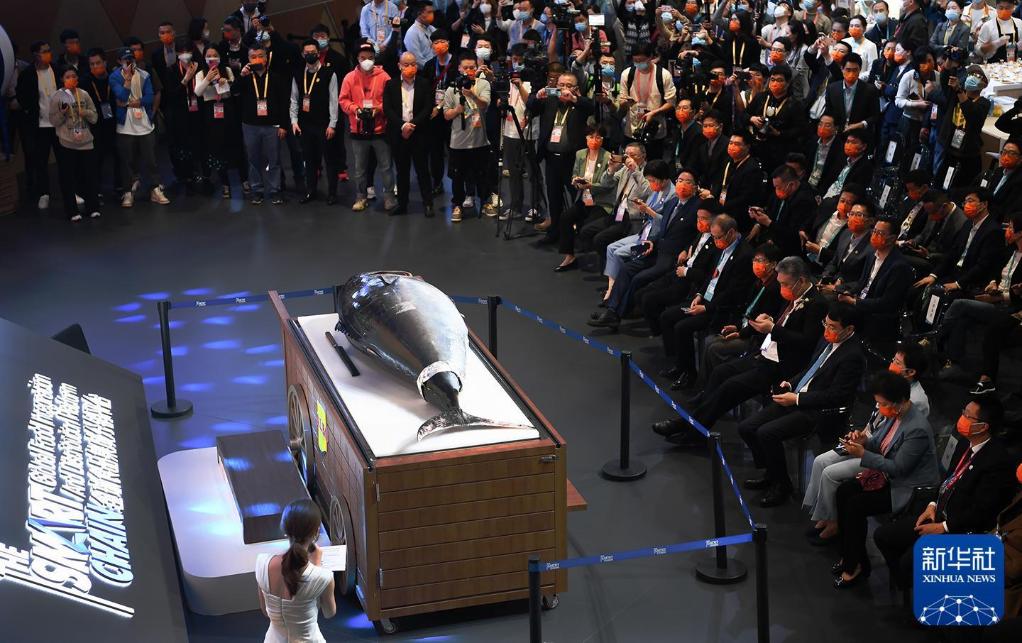 2021年11月6日,在上海举办的第四届进博会食品及农产品展区开鱼现场。新华社记者 邬惠我 摄