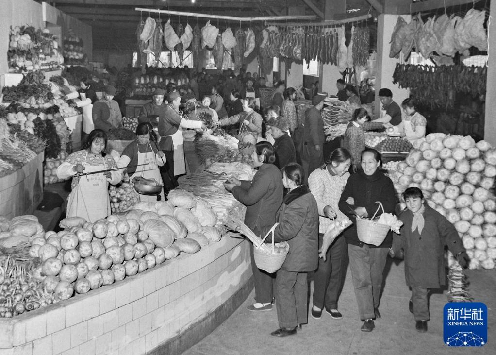1972年春节前夕,浙江杭州市民在菜市场选购副食品。新华社发(单金夫 摄)