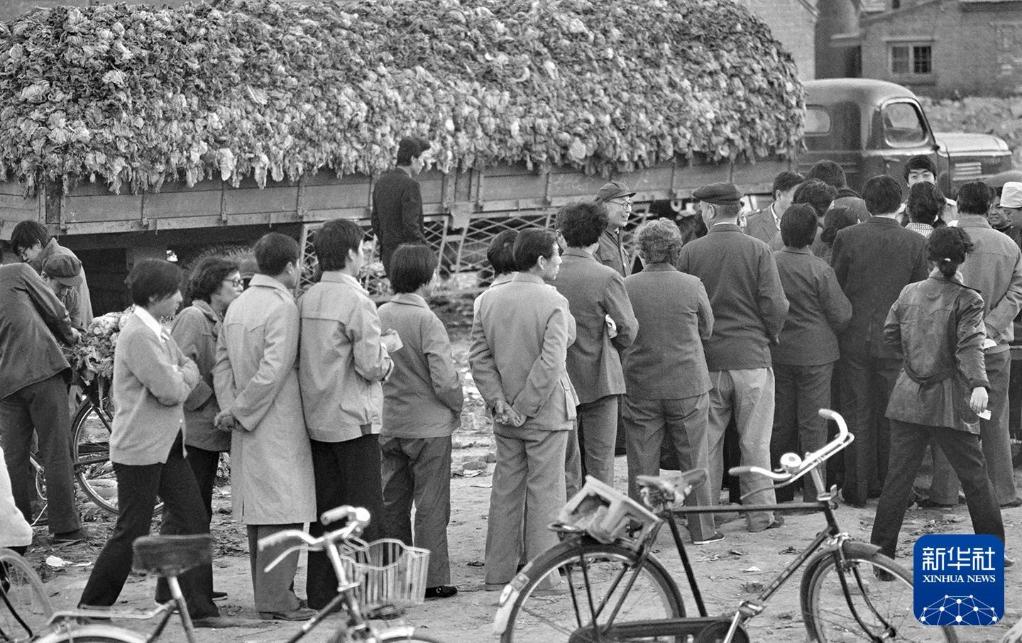 1988年11月,在北京一个冬储大白菜销售点前,市民排起长队,购买大白菜。新华社记者 李明放 摄