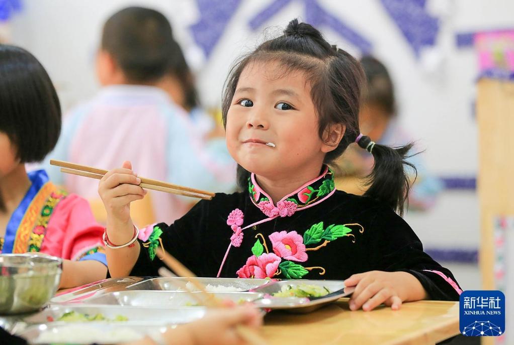 2017年9月6日,在贵州黔东南苗族侗族自治州凯里市易地扶贫搬迁后新建开园的开怀街道第十三幼儿园,新入园的4岁苗族小女孩潘承玥在吃免费营养午餐。新华社发(吴吉斌 摄)