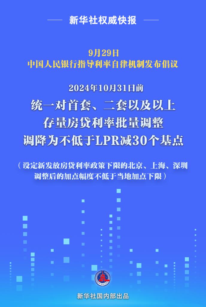 中国人民银行指导市场利率定价自律机制9月29日发布倡议,各商业银行应于2024年10月31日前统一对存量房贷(包括首套、二套及以上)利率实施批量调整,降为不低于LPR减30个基点。18家全国性商业银行原则上将不晚于10月12日发布操作细则。