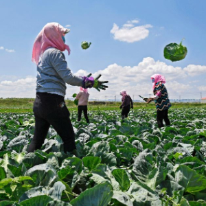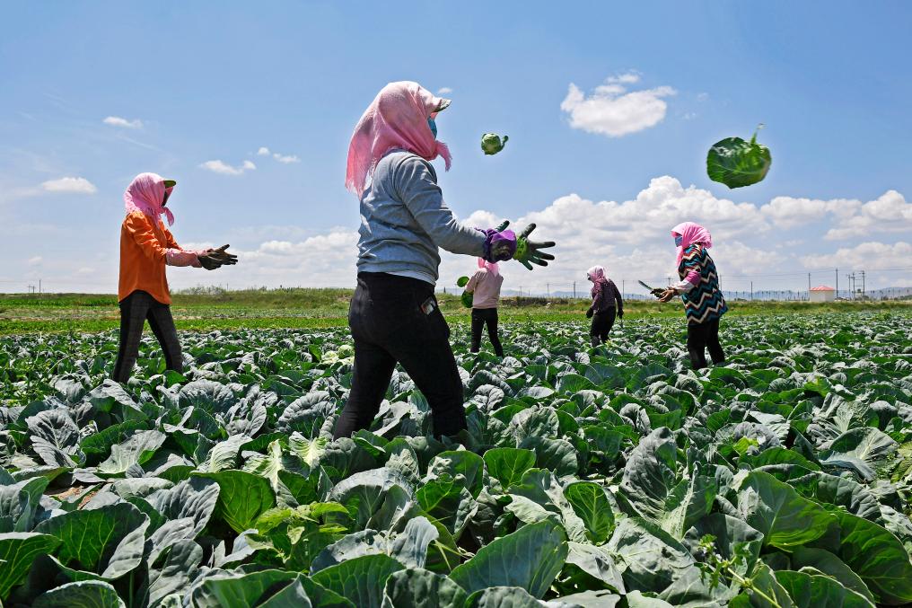 2017年6月30日,宁夏固原原州区彭堡镇姚磨村村民在蔬菜基地收获圆白菜。新华社记者 王鹏 摄