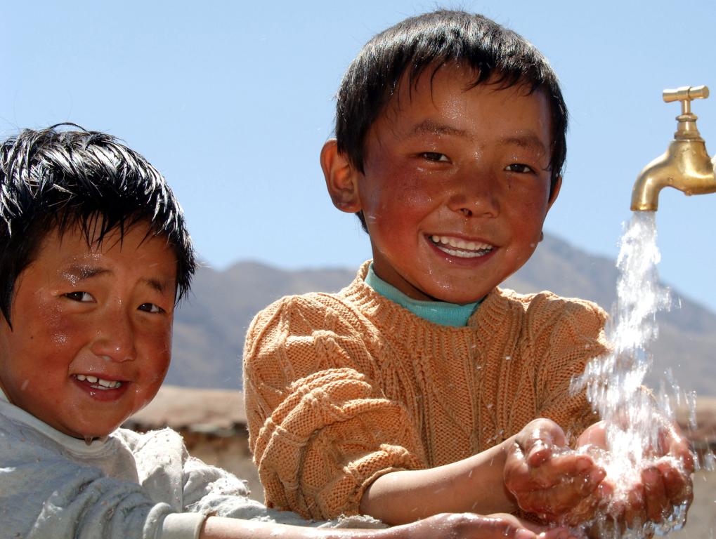 2006年4月9日,西藏达孜县朗热村的两名儿童用自来水洗脸。新华社记者 格桑达瓦 摄
