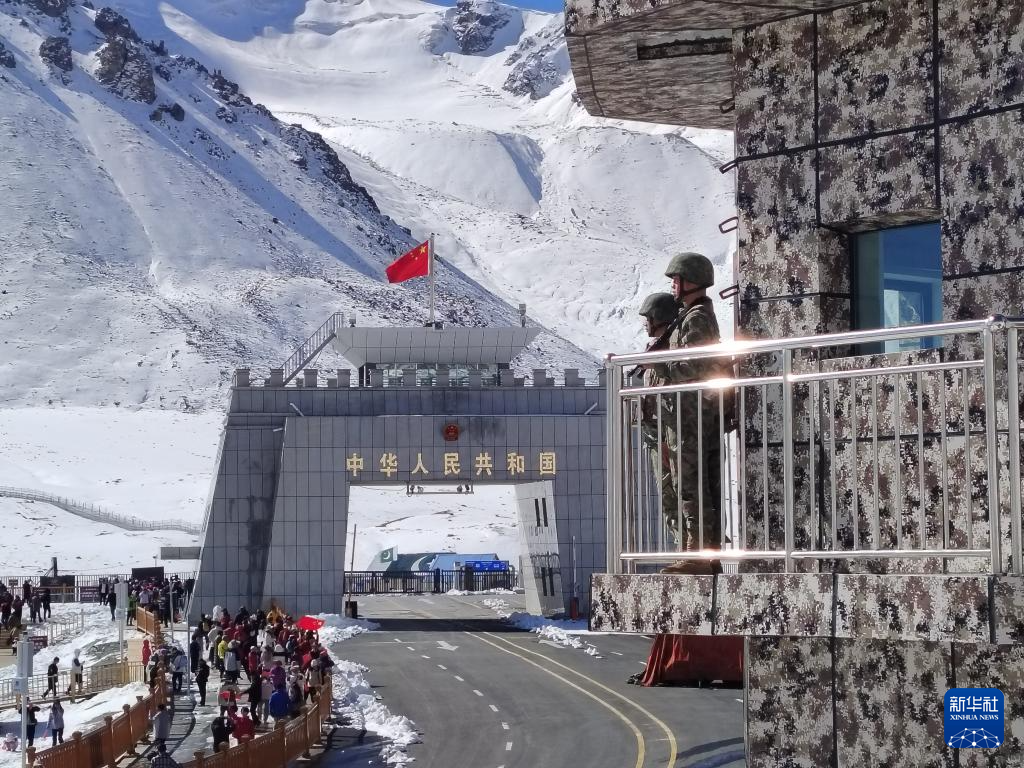 9月30日,斯姆哈纳边防连国门前哨班官兵巡逻走过国门。新华社发(陈斌 摄)