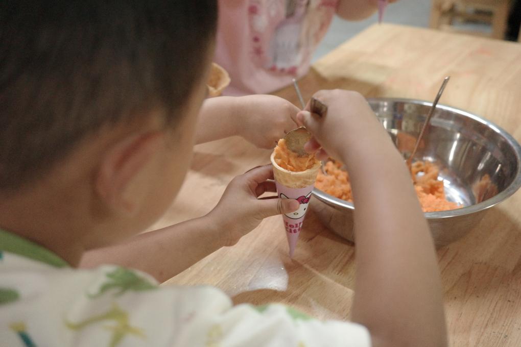 新华社长沙10月1日电(记者林建杰)挖上一勺红薯泥放入蛋筒,再撒上哈密瓜粒,孩子们在老师的引导下制作属于自己的“红薯冰淇淋”。“红薯冰淇淋”配上一盒牛奶,这是永顺县芙蓉镇七彩幼儿园孩子们的下午点心。