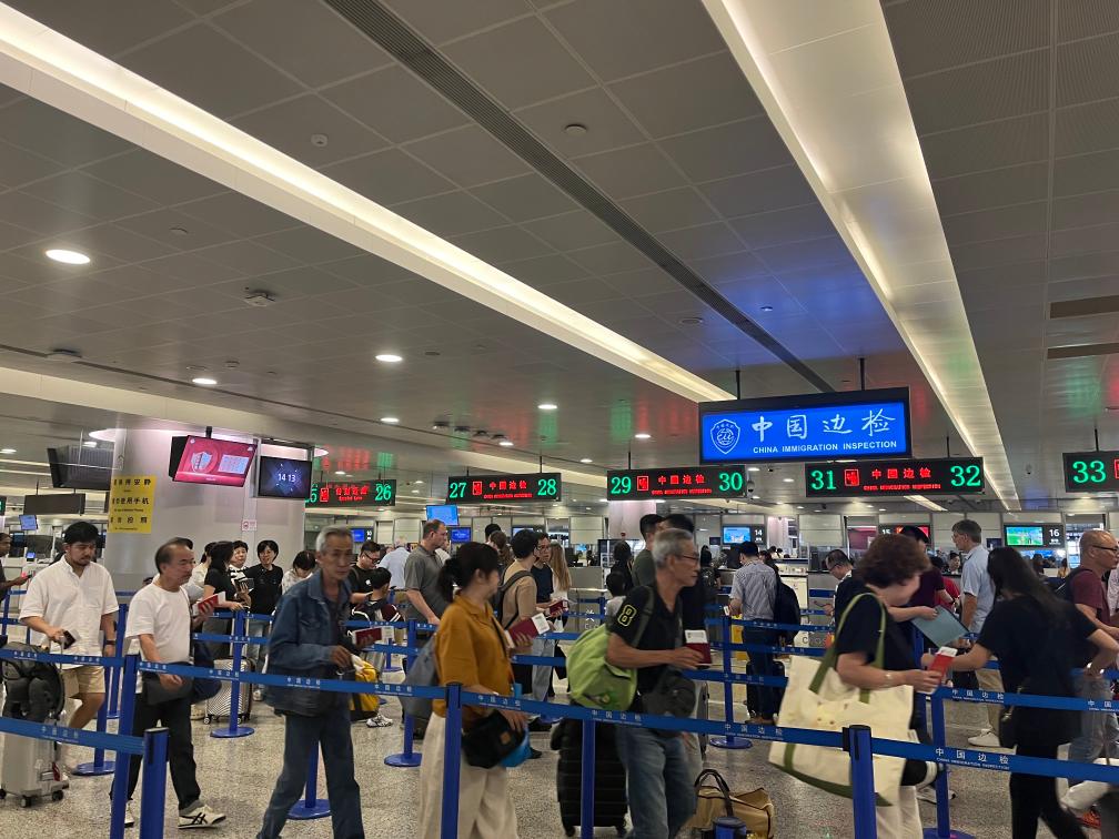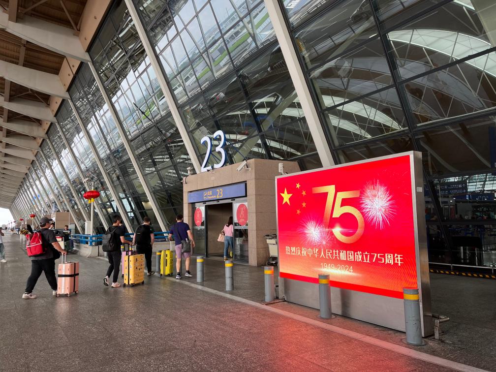 记者在浦东国际机场2号航站楼看到,鲜艳的国旗高高悬挂,到处洋溢着浓浓的节日氛围。在出境边检查验大厅,移民管理警察引导旅客有序办理边检查验手续,现场通关秩序井然。