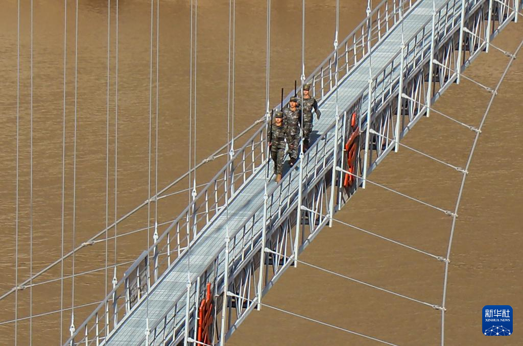 10月1日,武警山西总队忻州支队官兵在陕京输气管道黄河跨越段巡逻执勤。