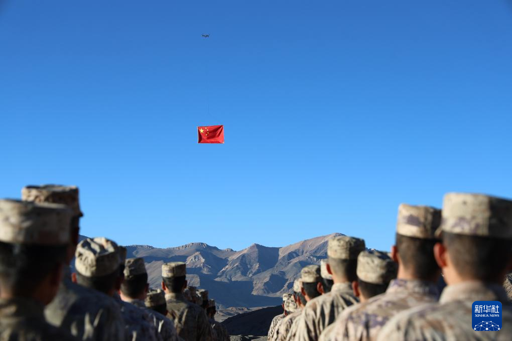 10月1日,新疆军区某红军团在喀喇昆仑雪域高原组织无人机升国旗仪式。