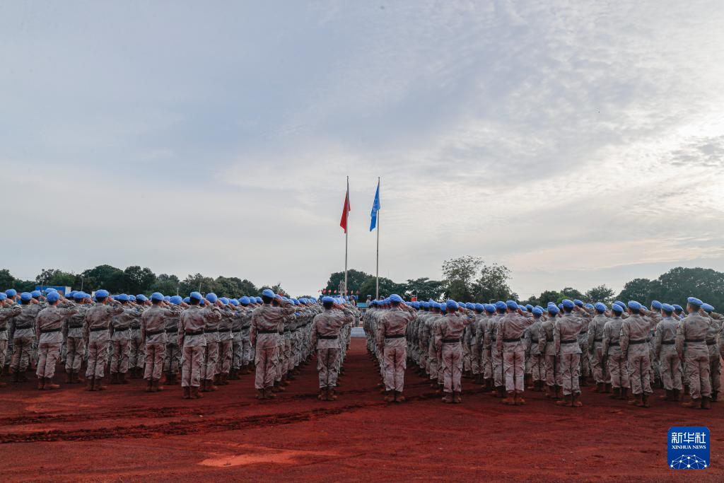 当地时间9月30日,中国第十四批赴南苏丹(瓦乌)维和部队官兵举行升旗仪式。