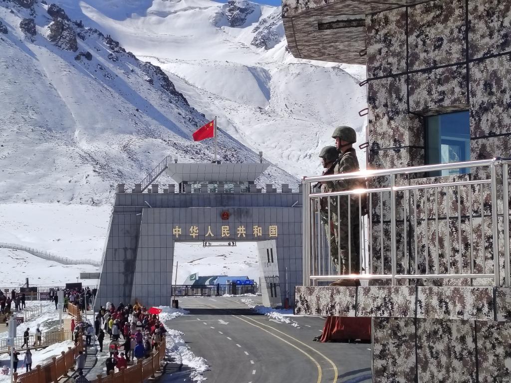 9月30日,红其拉甫边防连国门前哨班官兵在哨楼站岗执勤。新华社发(麻勇摄)