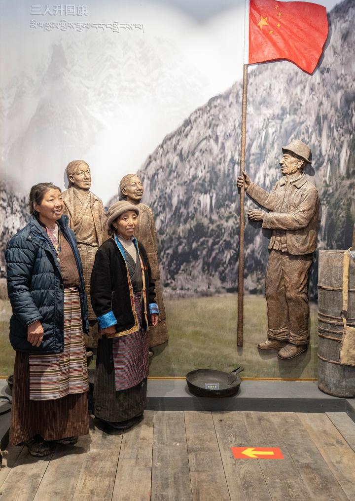 2023年6月10日,卓嘎(右)和央宗在桑杰曲巴故居中与描绘桑杰曲巴用自己缝制的国旗举行升旗仪式场景的壁画前合影。新华社记者 费茂华 摄