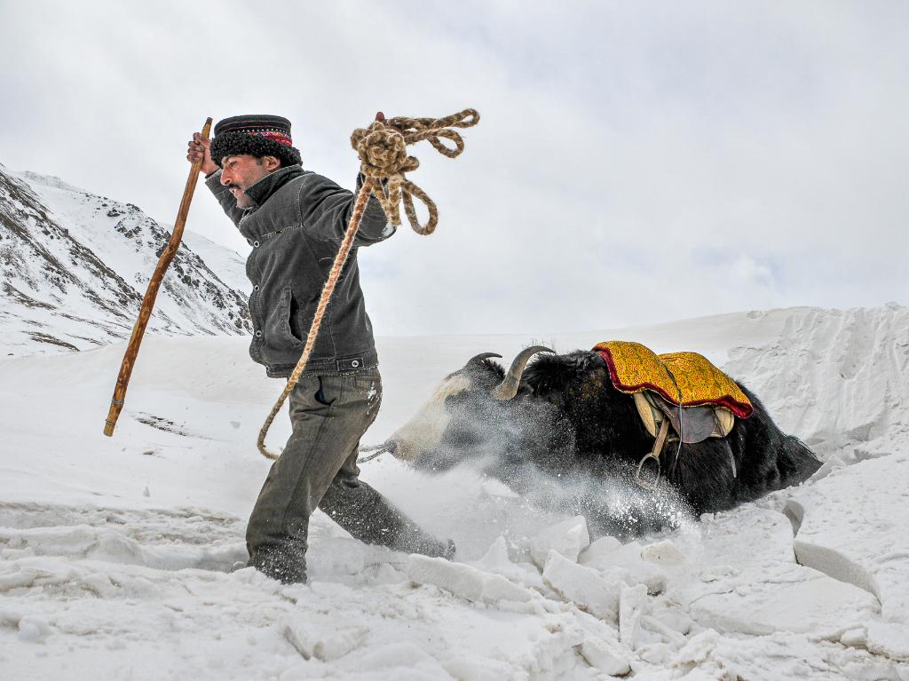 2009年3月6日,拉齐尼牵着牦牛踏着厚厚的积雪在边境线上巡逻。新华社发(王烈 摄)