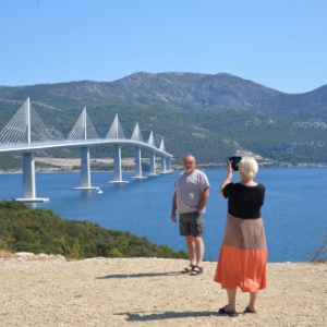 2024年7月26日,游客与克罗地亚佩列沙茨大桥合影留念。当日,由中国路桥公司牵头的中国企业联合体承建的克罗地亚佩列沙茨大桥迎来通车两周年。(新华社记者李学军摄)