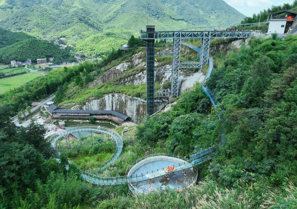 2023年8月3日,游客在浙江湖州安吉县鄣吴镇利用废弃矿山改建的漂流点体验空中漂流。新华社记者 翁忻旸 摄