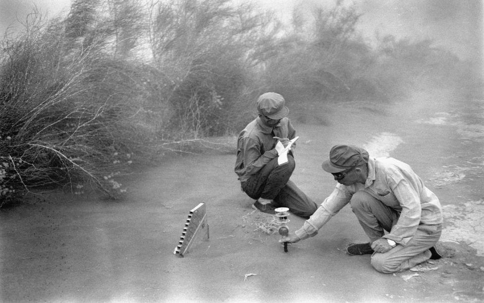 20世纪70年代,科研人员冒着十级大风,在新疆吐鲁番盆地火焰山下沙漠植物园内观测风速变化,研究沙漠植物的防风作用(资料照片)。新华社记者 刘云莱 摄