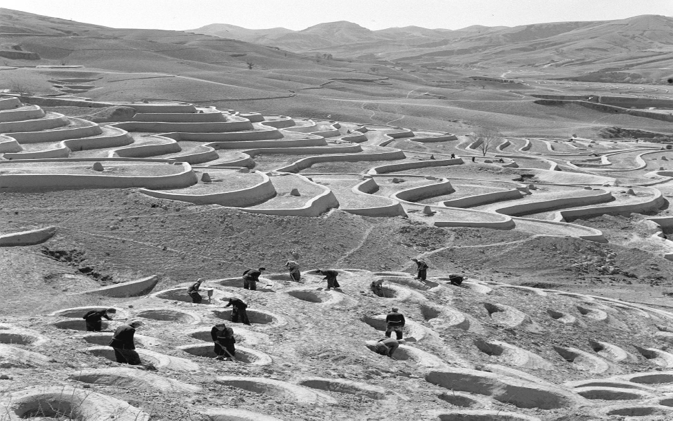 20世纪60年代,陕西延安县梁村人民公社社员们在为栽树作准备(资料照片)。人们把缓坡修成水平梯田,在陡坡上挖鱼鳞坑植树,防止水土流失。新华社记者 和坪 摄