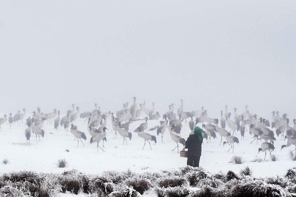 2016年2月25日,云南昭通护鹤人在霏霏雨雪中给高原珍稀鹤类黑颈鹤投食。新华社记者 胡超 摄