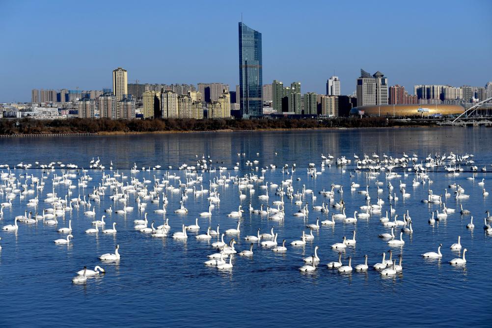 2018年2月2日,白天鹅在河南三门峡黄河湿地栖息。新华社记者 朱祥 摄