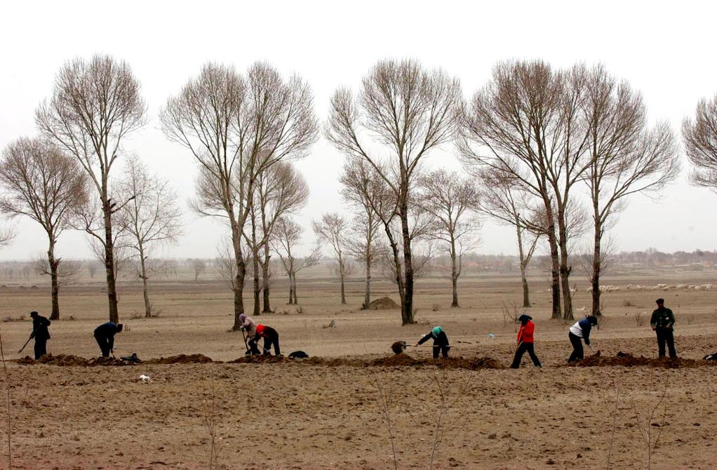 2002年4月,河北张北县郝家营乡农民在退耕还林的土地上植树(资料照片)。新华社记者 周文广 摄
