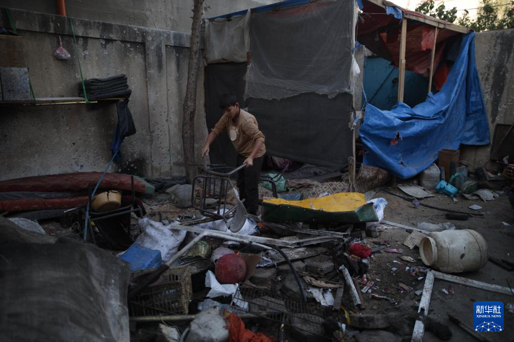 10月2日,在加沙地带努赛赖特难民营,一名男孩整理受损物品。新华社发(马尔万·达乌德摄)