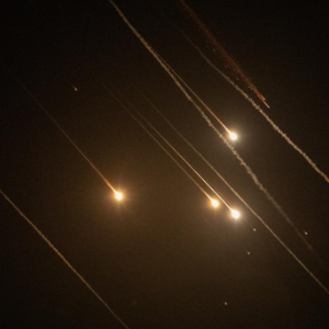 10月1日,以军防空系统拦截的发射物从耶路撒冷上空飞过。新华社记者陈君清摄