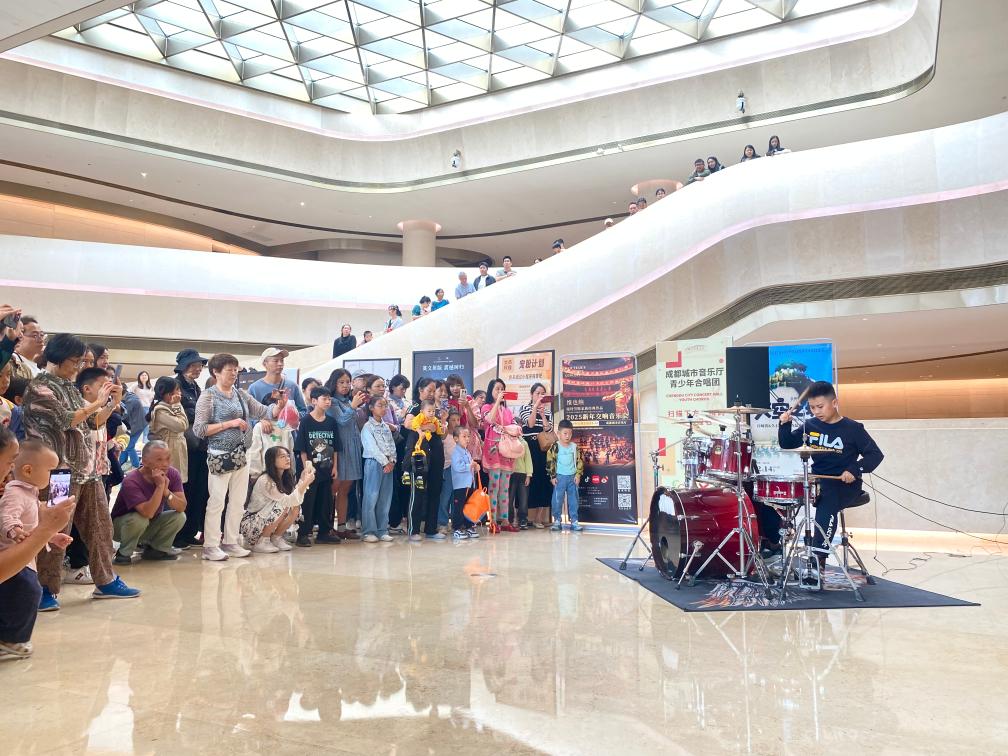 10月1日上午,《我爱你中国》的动人旋律萦绕在成都城市音乐厅共享大厅,不少市民在台阶上席地而坐,跟随旋律合唱鼓掌。这是成都城市音乐厅在国庆假期组织的免费公众开放日主题活动现场。
