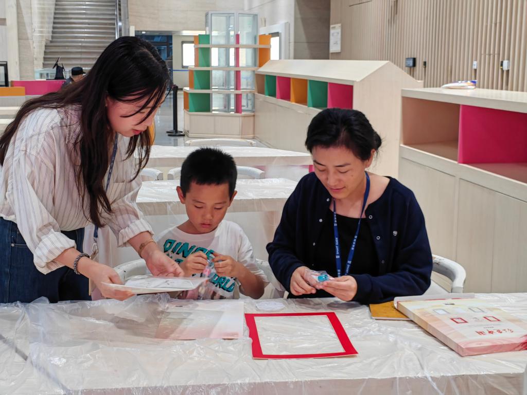 在成都博物馆社教区,家长带着小朋友在参加国潮手工体验活动。新华社记者董小红 摄