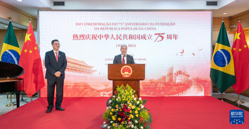 9月25日,巴西副外长劳德马尔(右)在巴西利亚举行的庆祝中华人民共和国成立75周年招待会上致辞。新华社记者 王天聪 摄