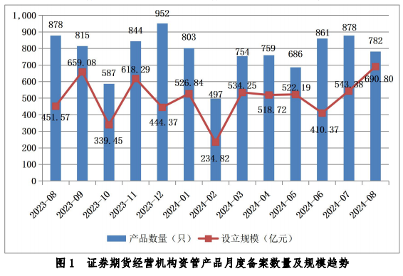 中国基金业协会近日发布的数据显示,2024年8月,证券期货经营机构共备案私募资管产品782只,环比减少10.93%,同比减少10.93%;设立规模690.80亿元,环比增长27.13%,同比增长52.98%。