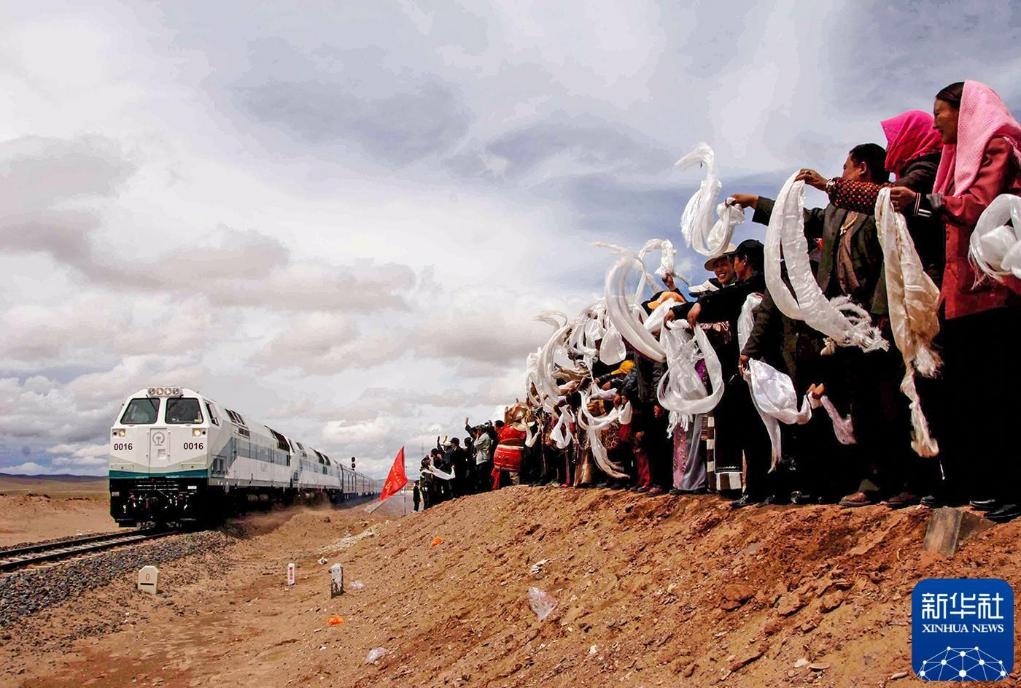2006年7月1日,青藏铁路全线通车。在青海沱沱河大桥桥头,当地群众欢迎从格尔木出发的“青1”次列车。新华社记者 陈燮 摄