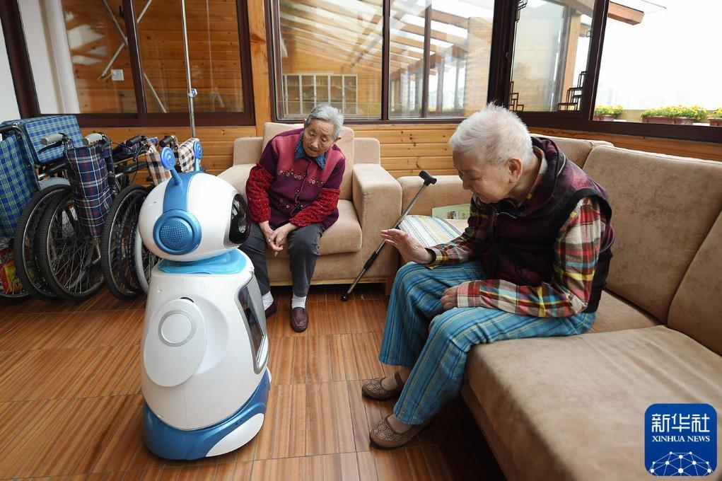 2016年5月24日,在浙江杭州社会福利中心,一位老人通过智能养老机器人“阿铁”与家属视频通话。新华社记者 黄宗治 摄